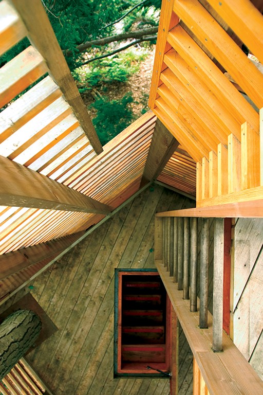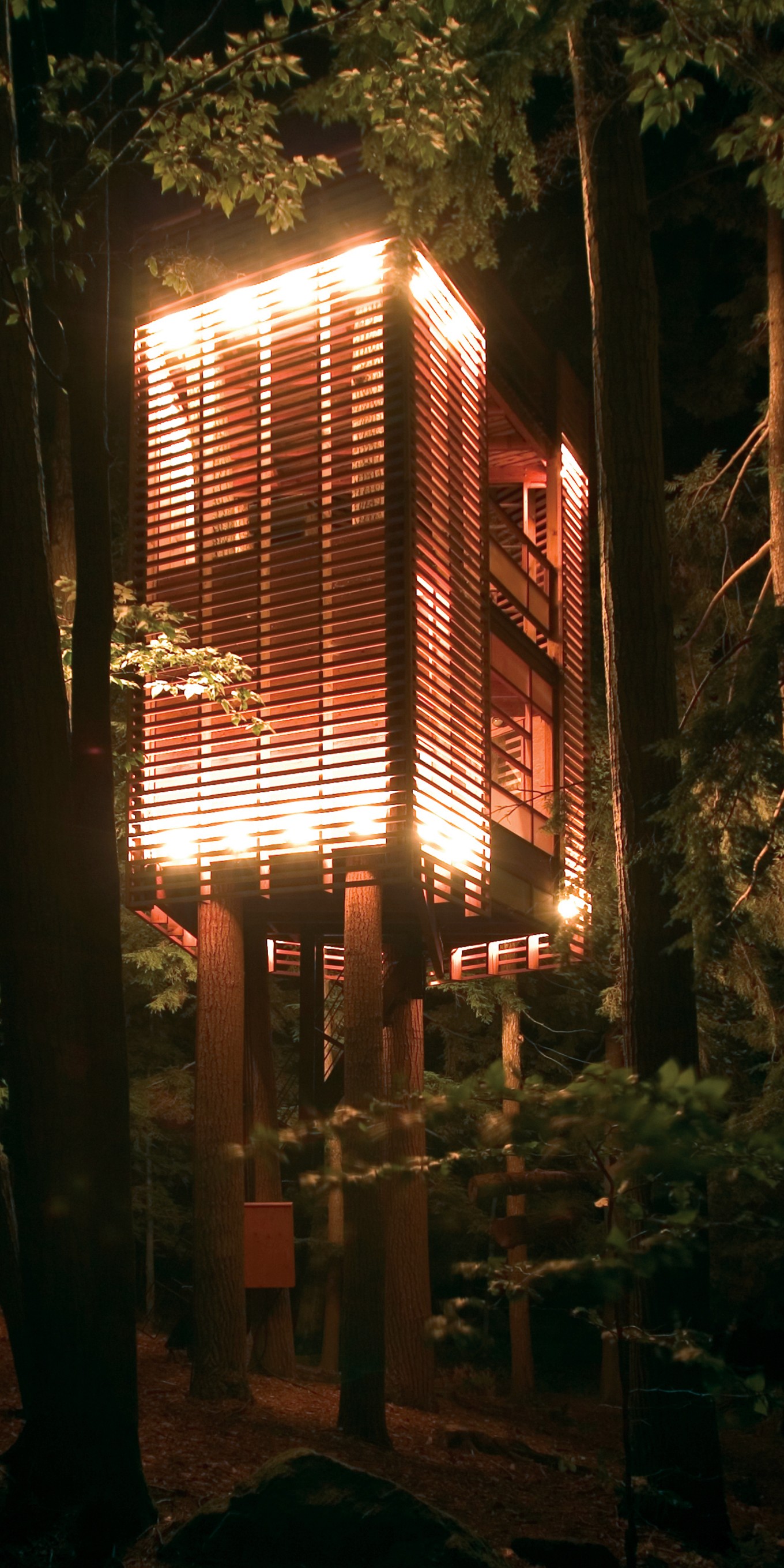 The structure wraps the trunks rather than fighting them, using a light Muskoka frame carefully hung with one high-strength steel cable per tree to minimize impact.
