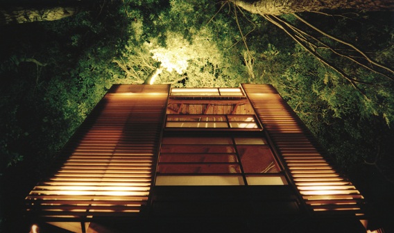 A lattice skin filters daylight into shifting patterns, then glows at night—soft, warm, and weightless in the canopy.