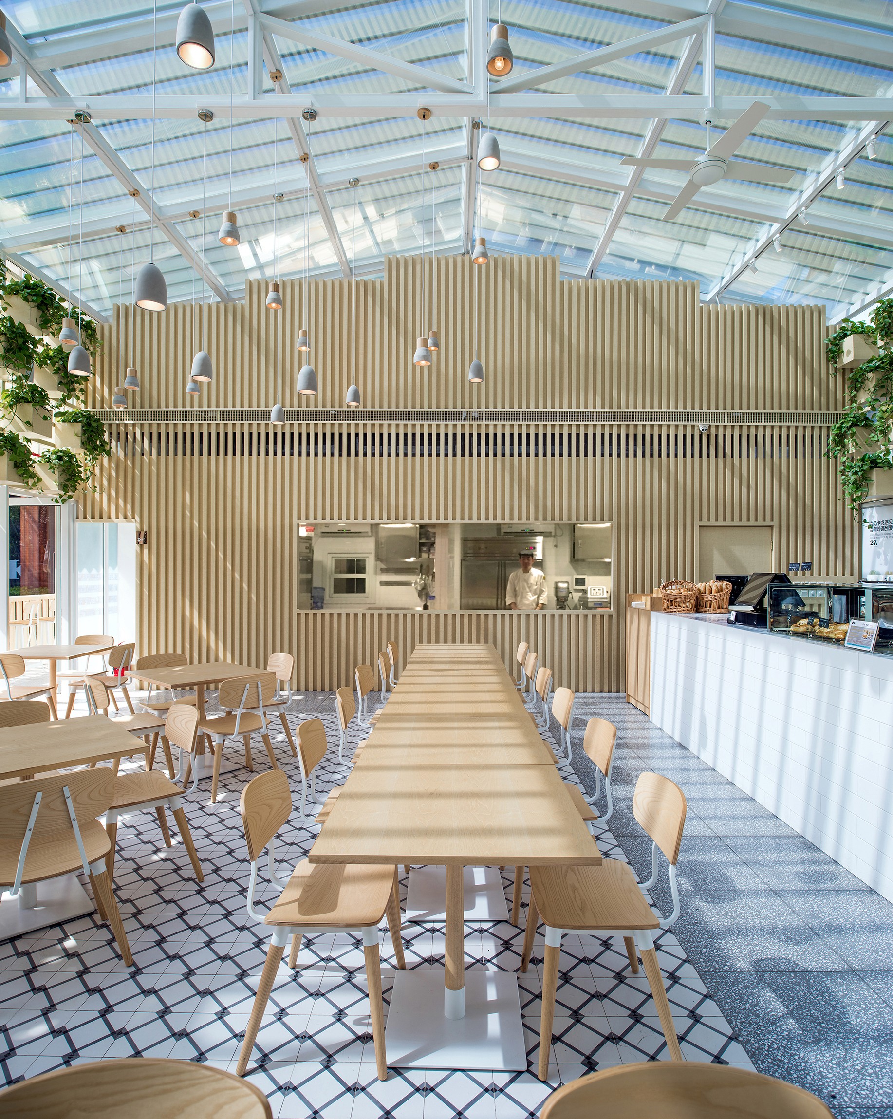 Organic coffee, salads, and Japanese pastries keep the offering clean and light, with the pastry kitchen revealed through a punched opening—turning craft into part of the experience.