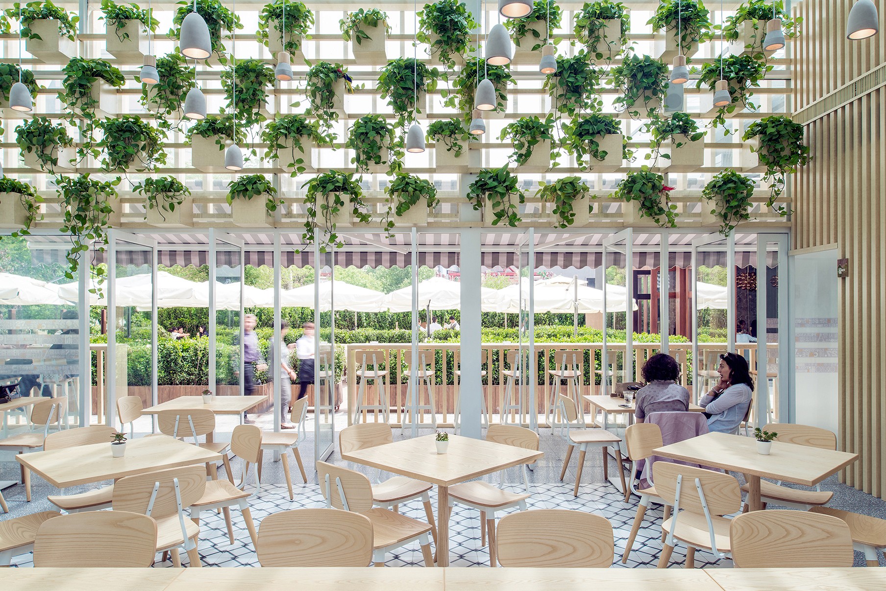 A garden café inside a restored glass greenhouse in Beijing’s Lido Park.