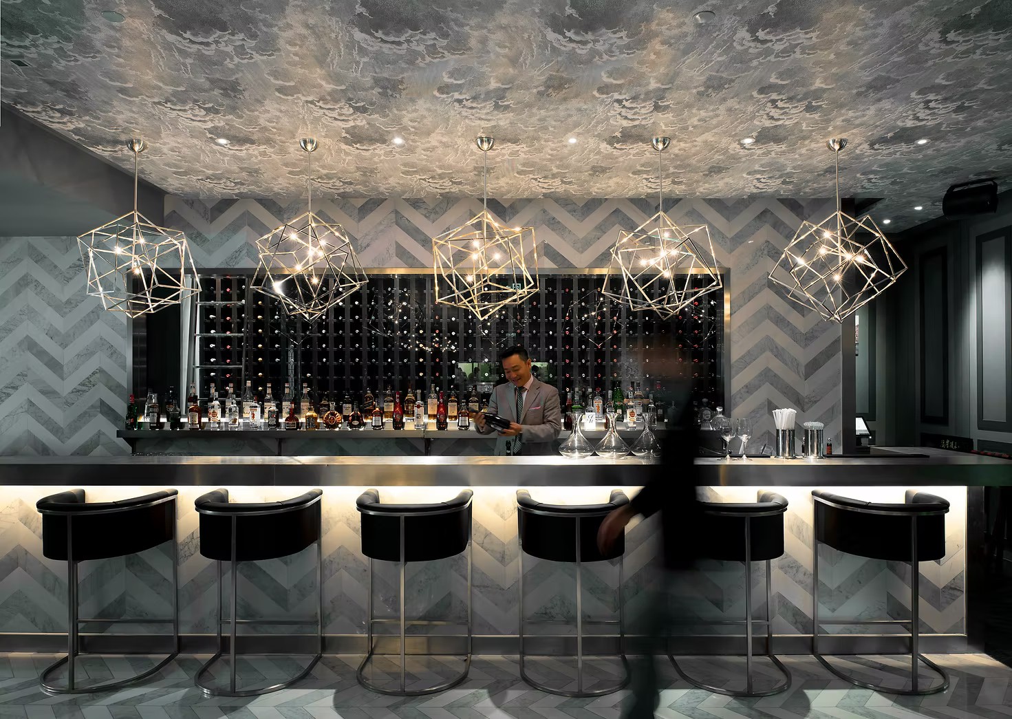A glass wine cellar glows behind the bar, while slanted cube lights and explosive brass fixtures bring warmth and shadow to the room.