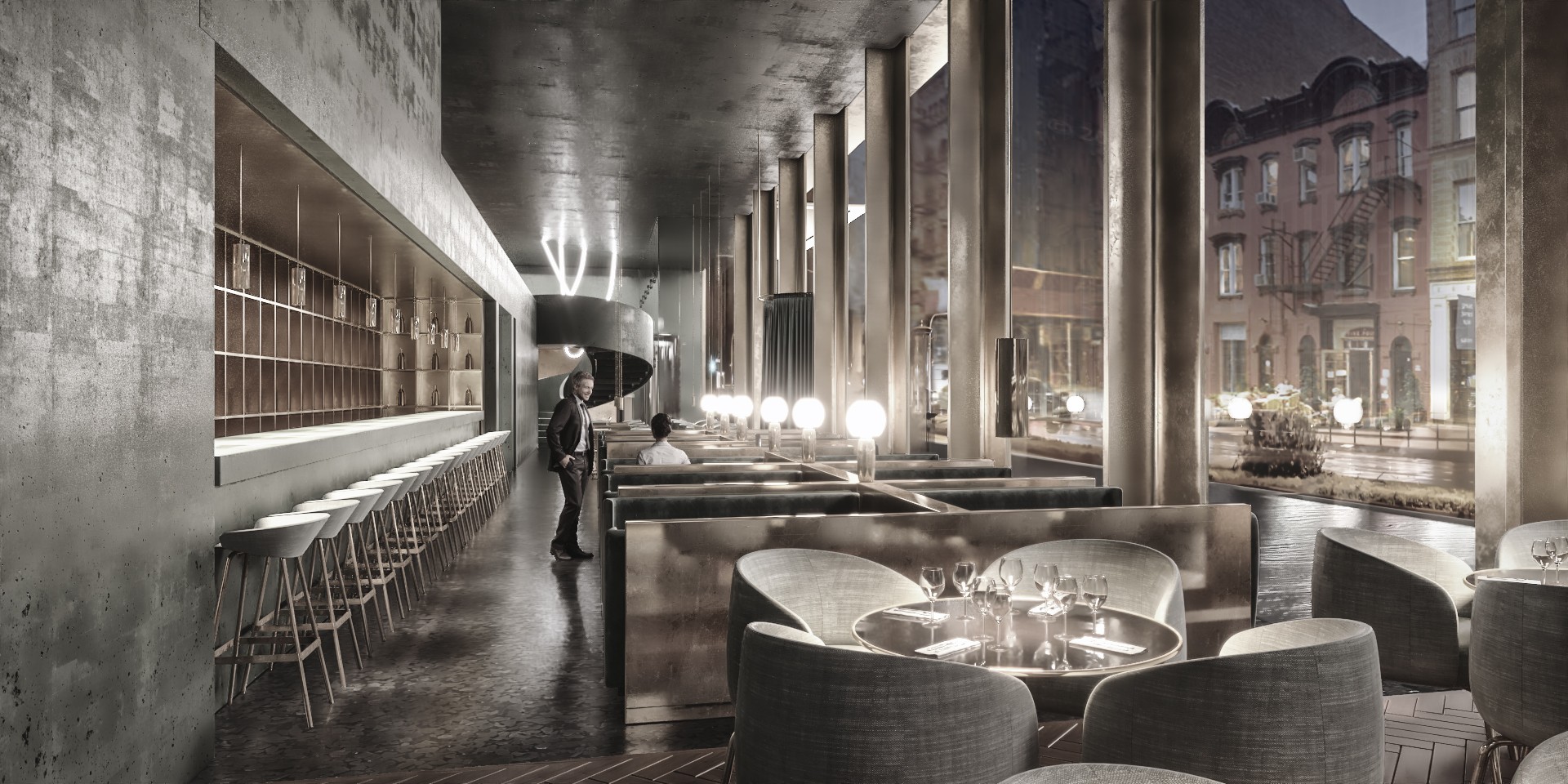 Inside, essential materials and sharp contrasts carry through, anchored by a green terrazzo bar and generous glazing that keeps the city close.