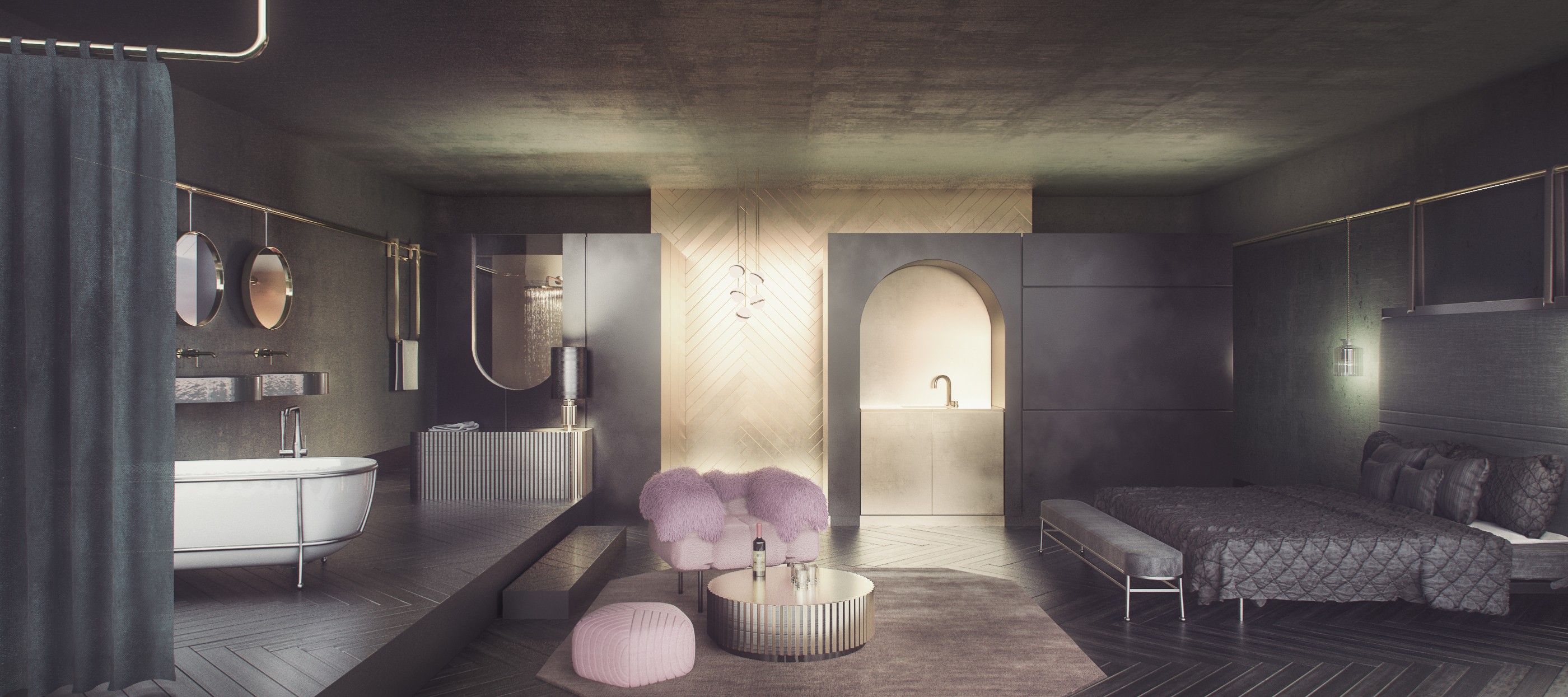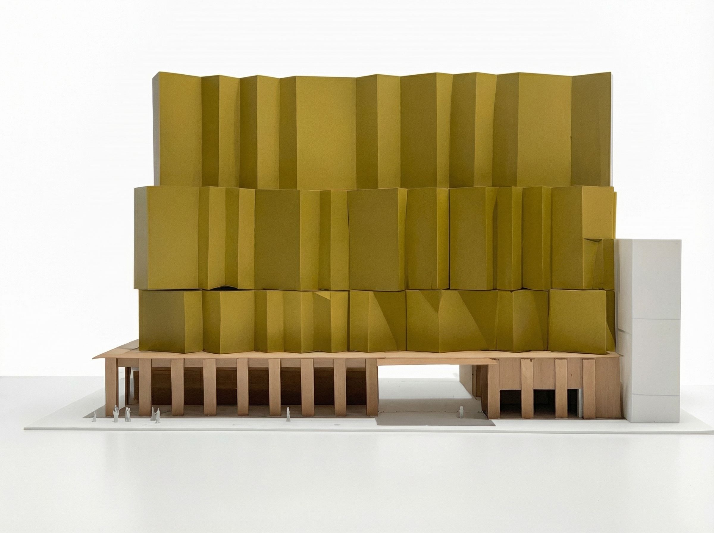 Above, a second zone shifts the tone: rectilinear gold “ribbons” sculpt the room volumes into an undulating façade—dynamic against the steady structure below.