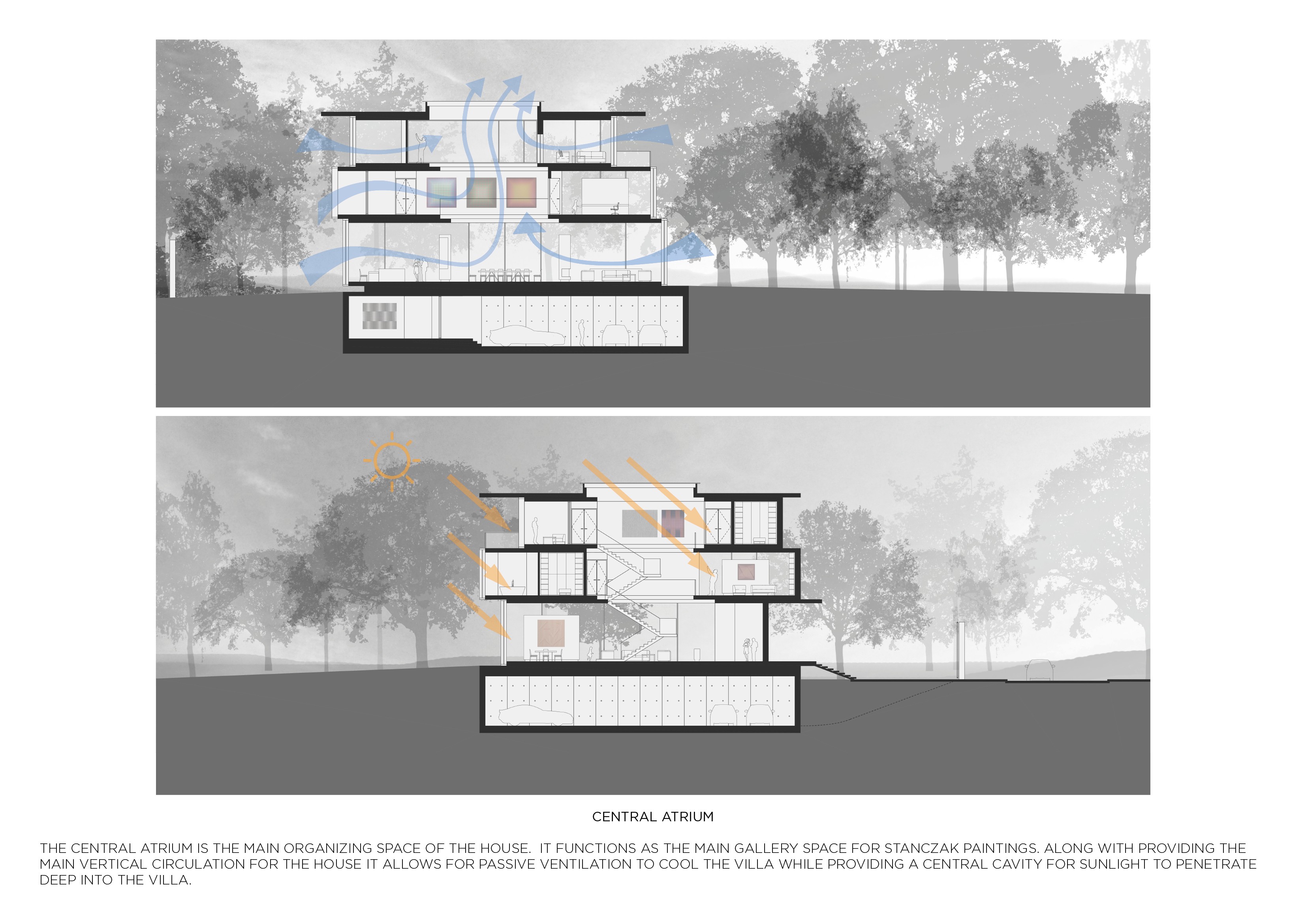 A central courtyard rises through all three floors and is capped with a large skylight, drawing daylight deep into the home and turning circulation into a lived-in gallery.