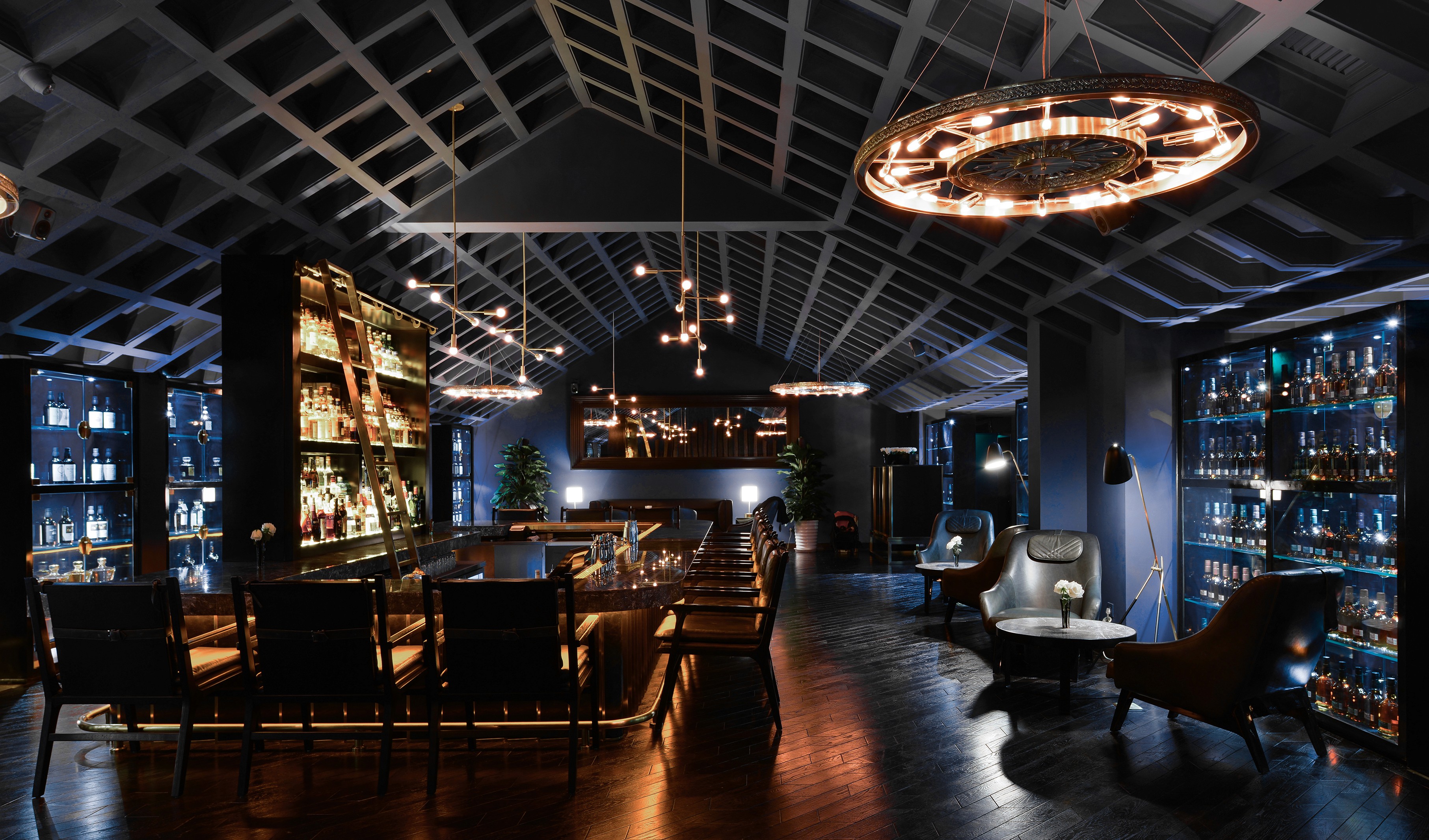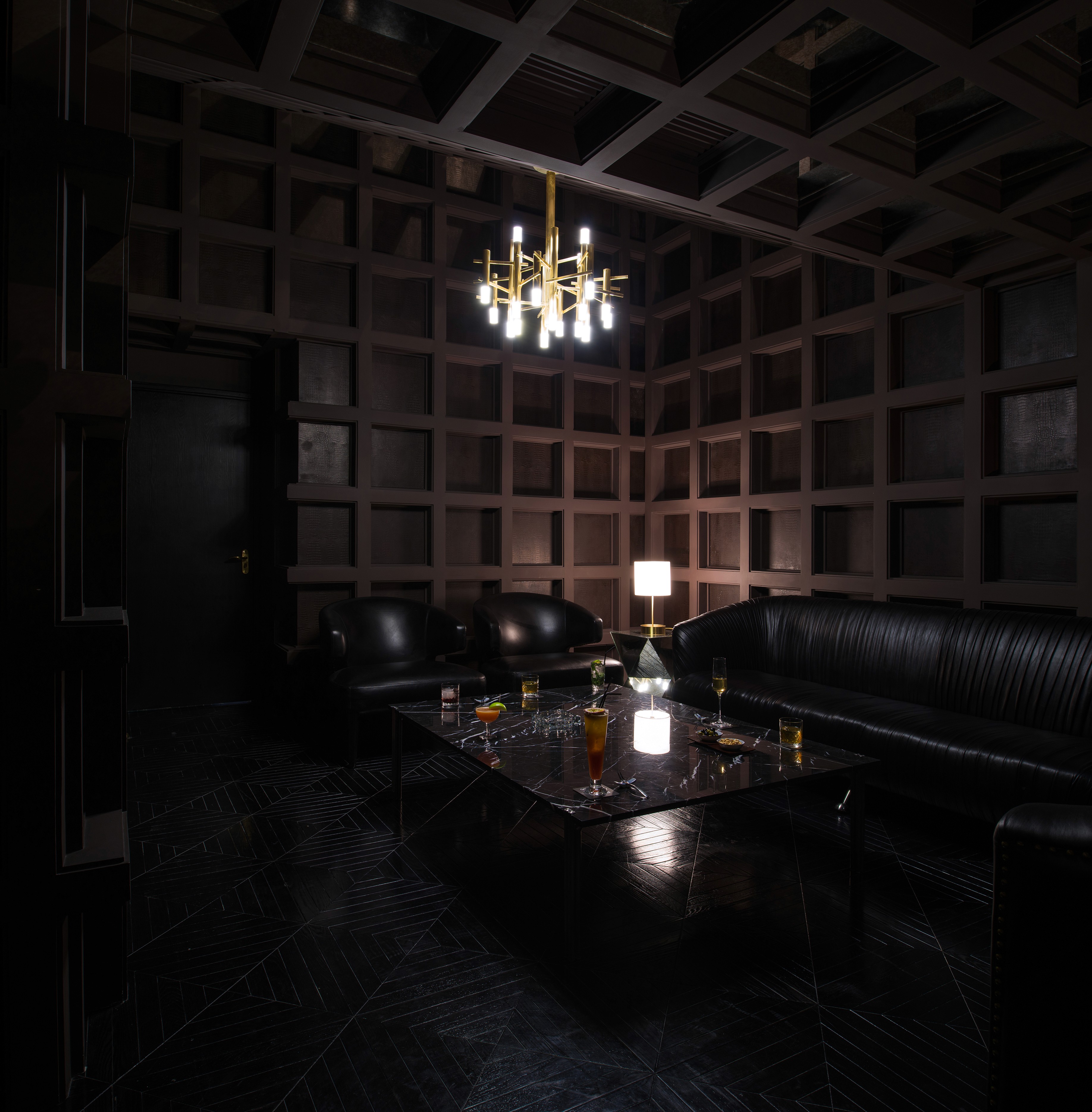 A glass wine cellar glows behind the bar, while slanted cube lights and explosive brass fixtures bring warmth and shadow to the room.