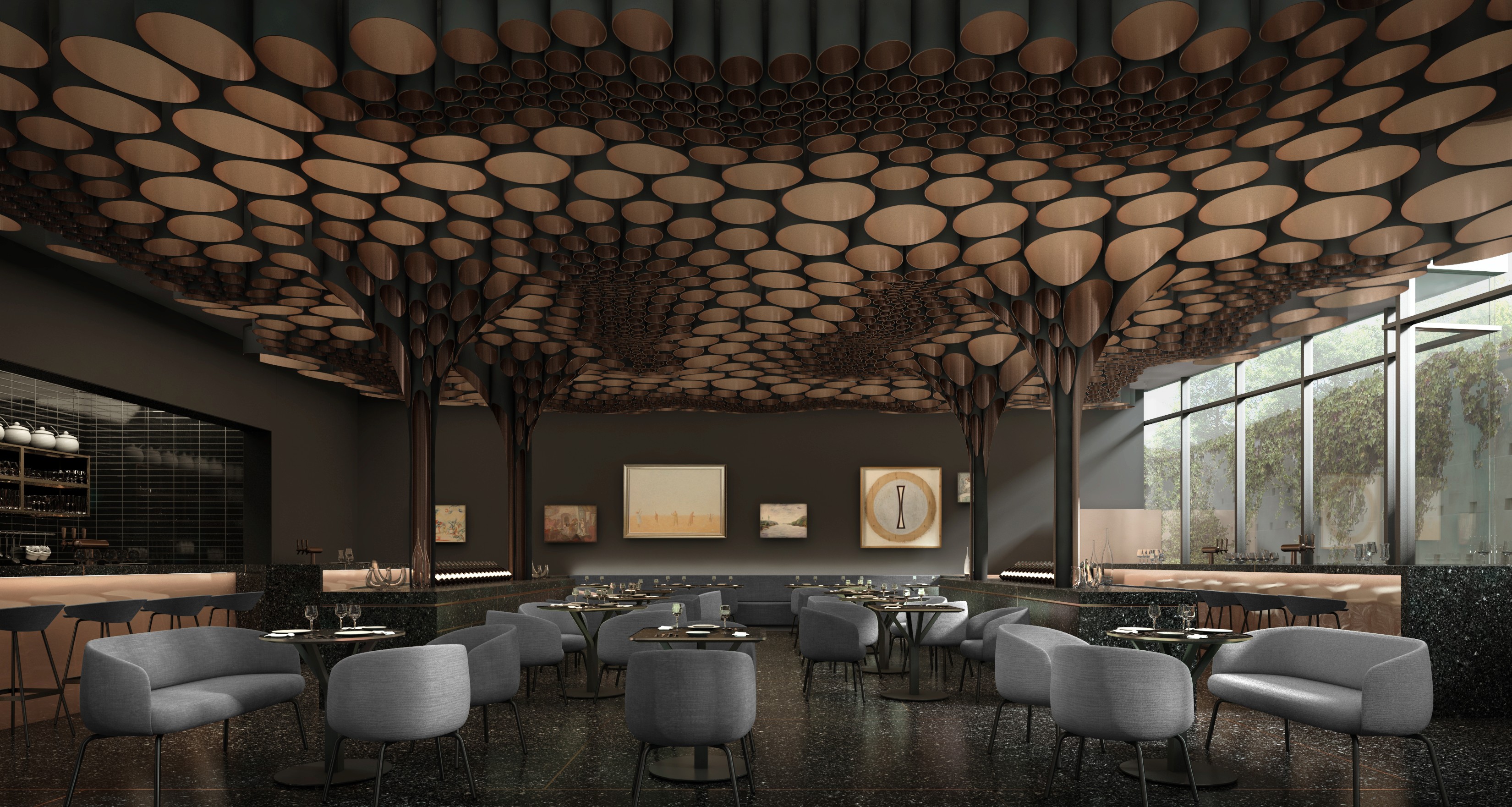 Created to serve patrons of the DESA Unicum private art gallery for both lunch and dinner, the space balances privacy and drama with a table mix and bar energy that stays active without feeling loud.
