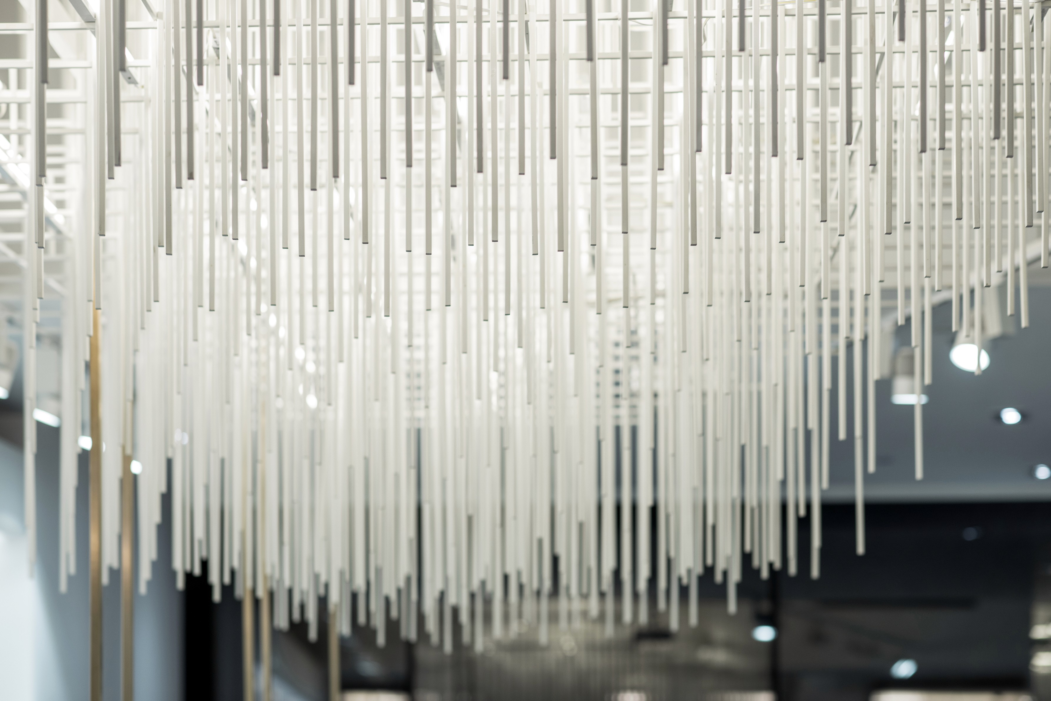A sculptural “cloud” suspended from the ceiling becomes the signature: ambient, luminous, and visible from the street, drawing people up and anchoring the brand.