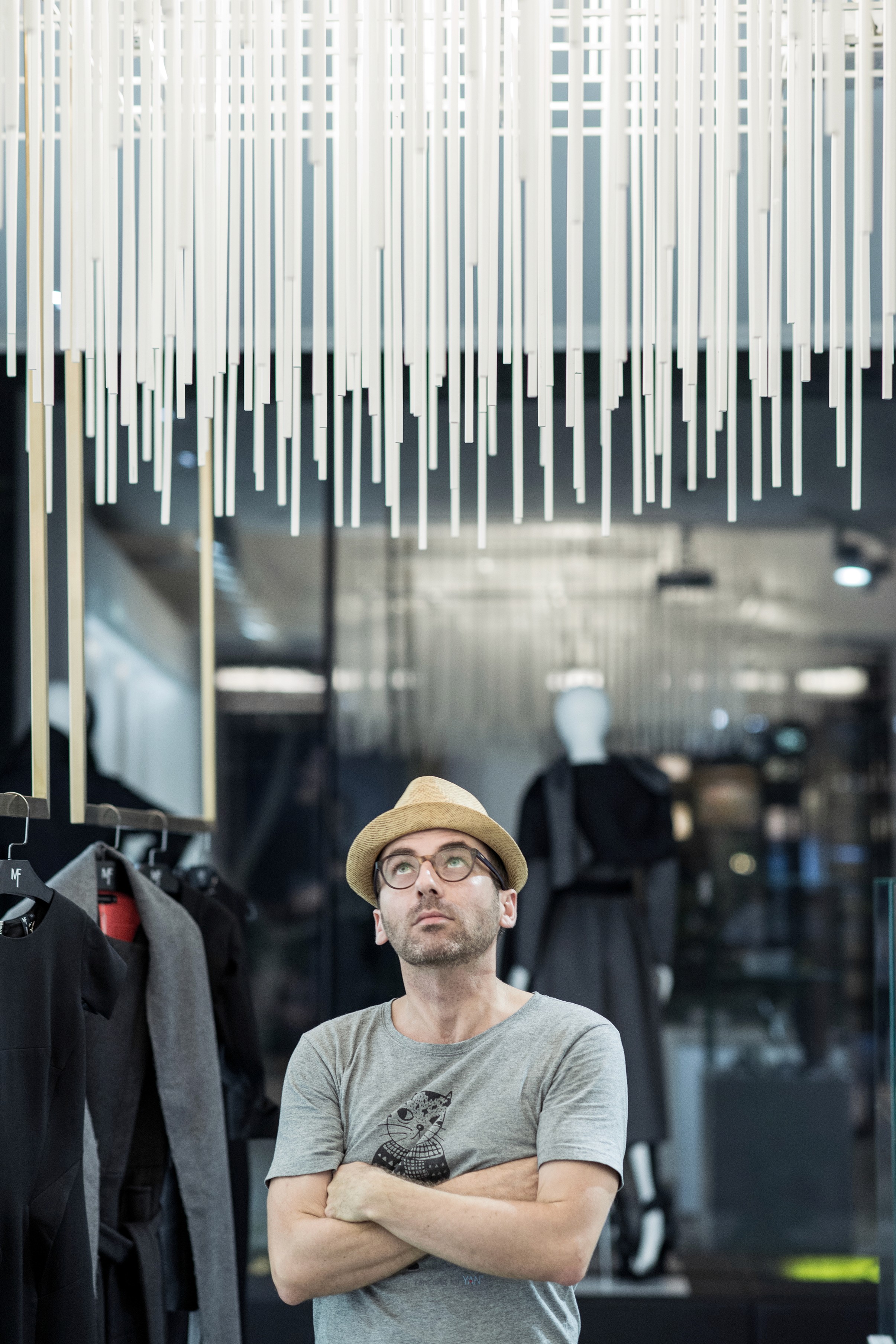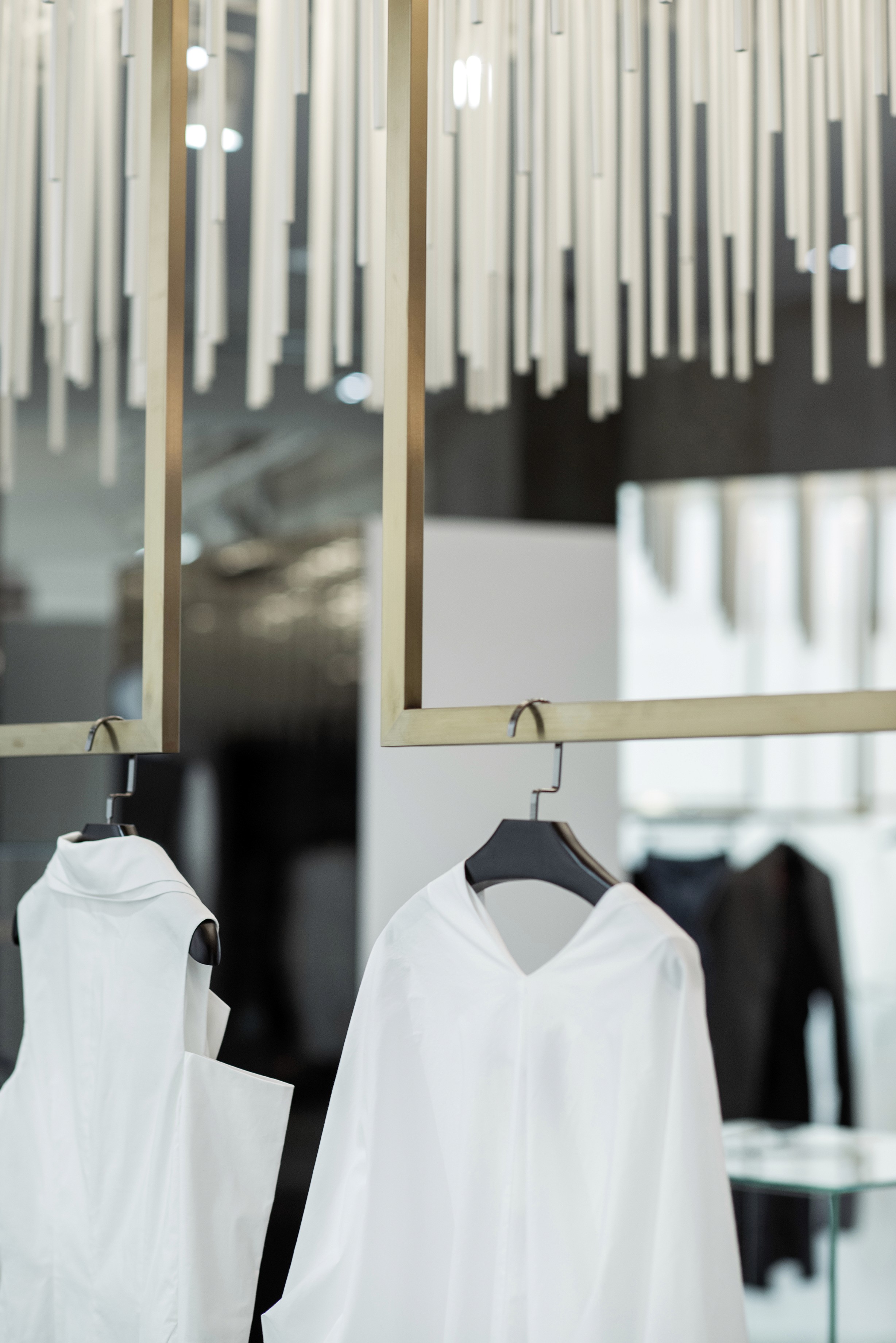 Exposed concrete walls keep the atmosphere honest, while crisp white cubic volumes organize fitting rooms and checkout with clean precision.