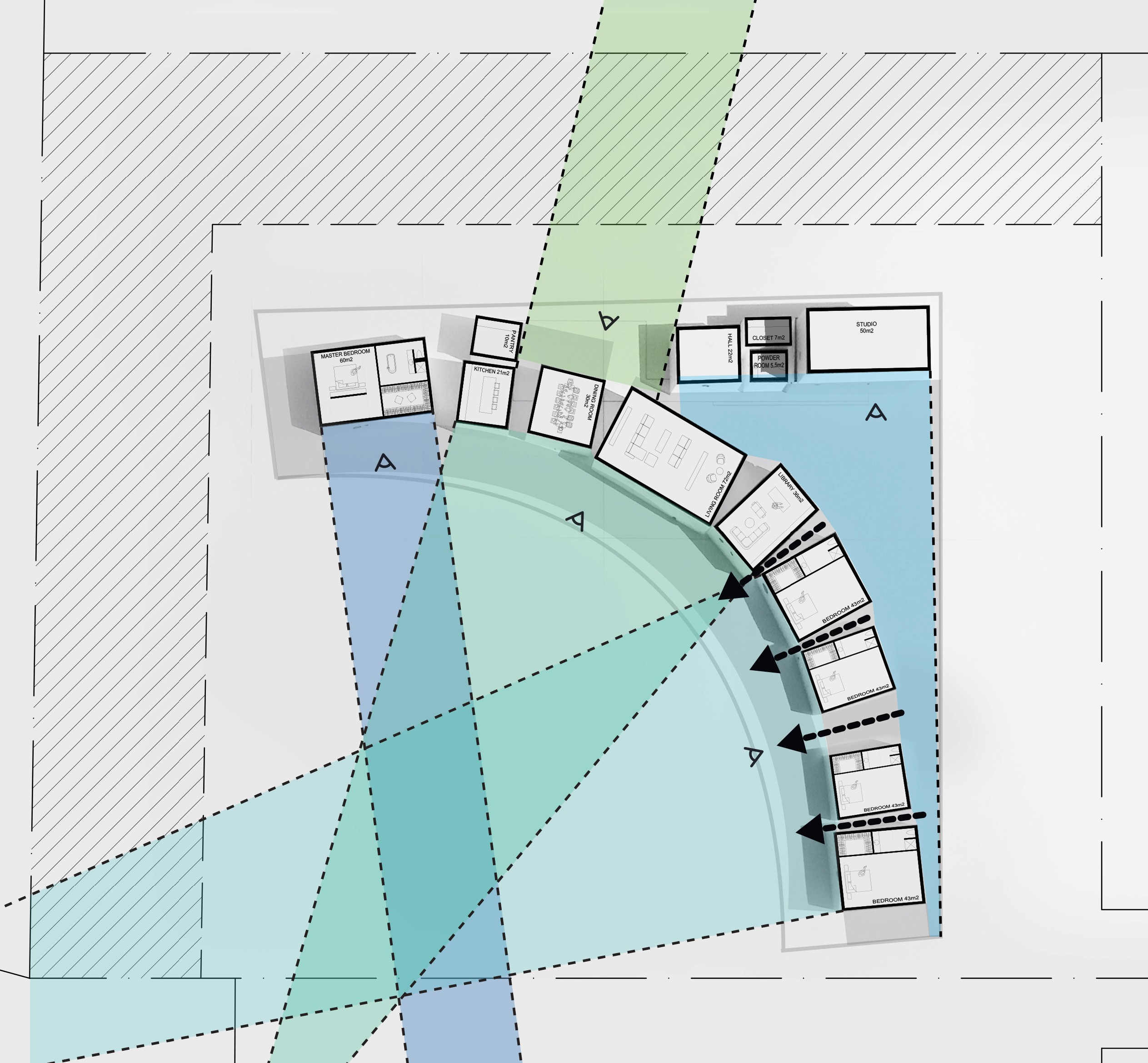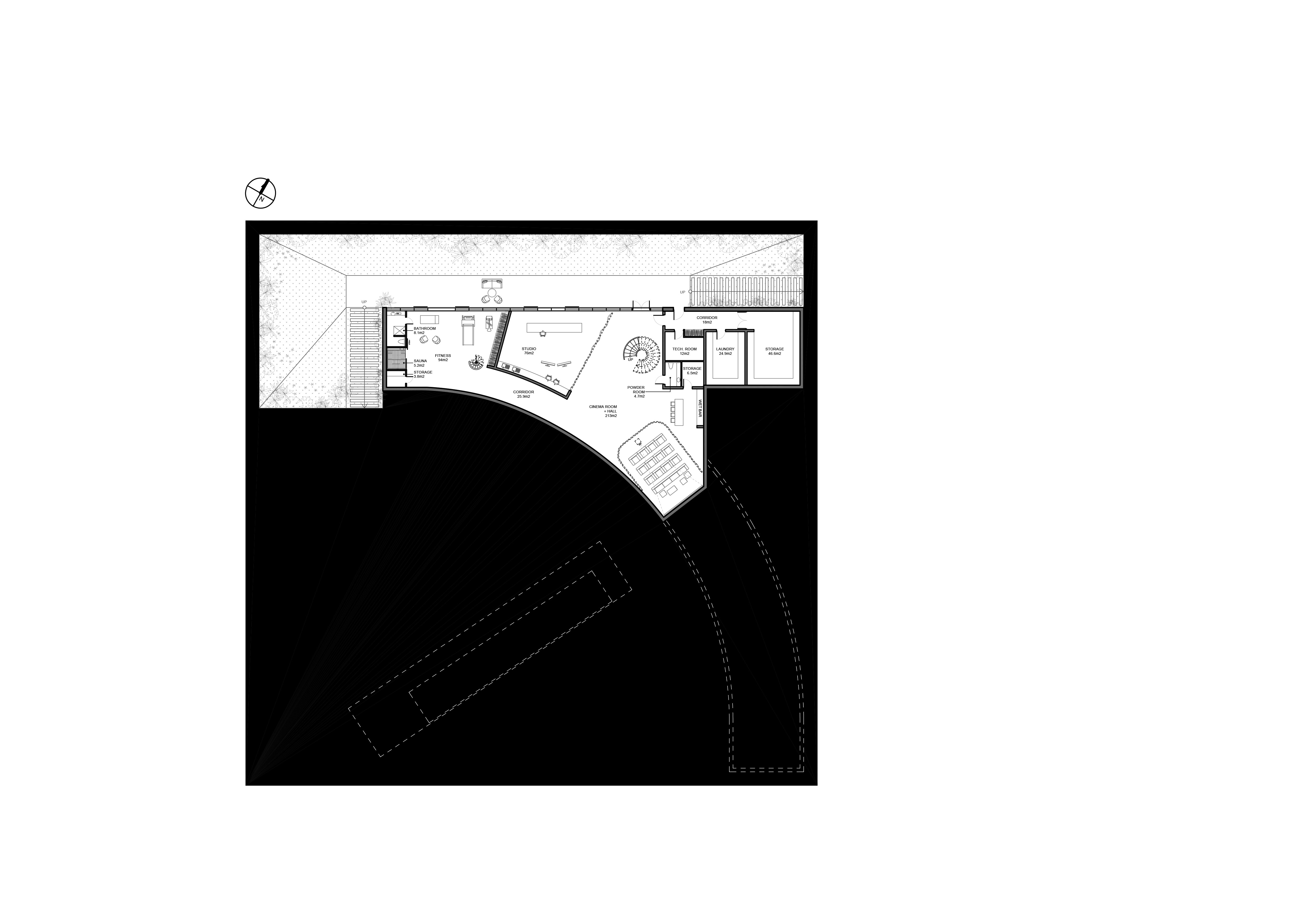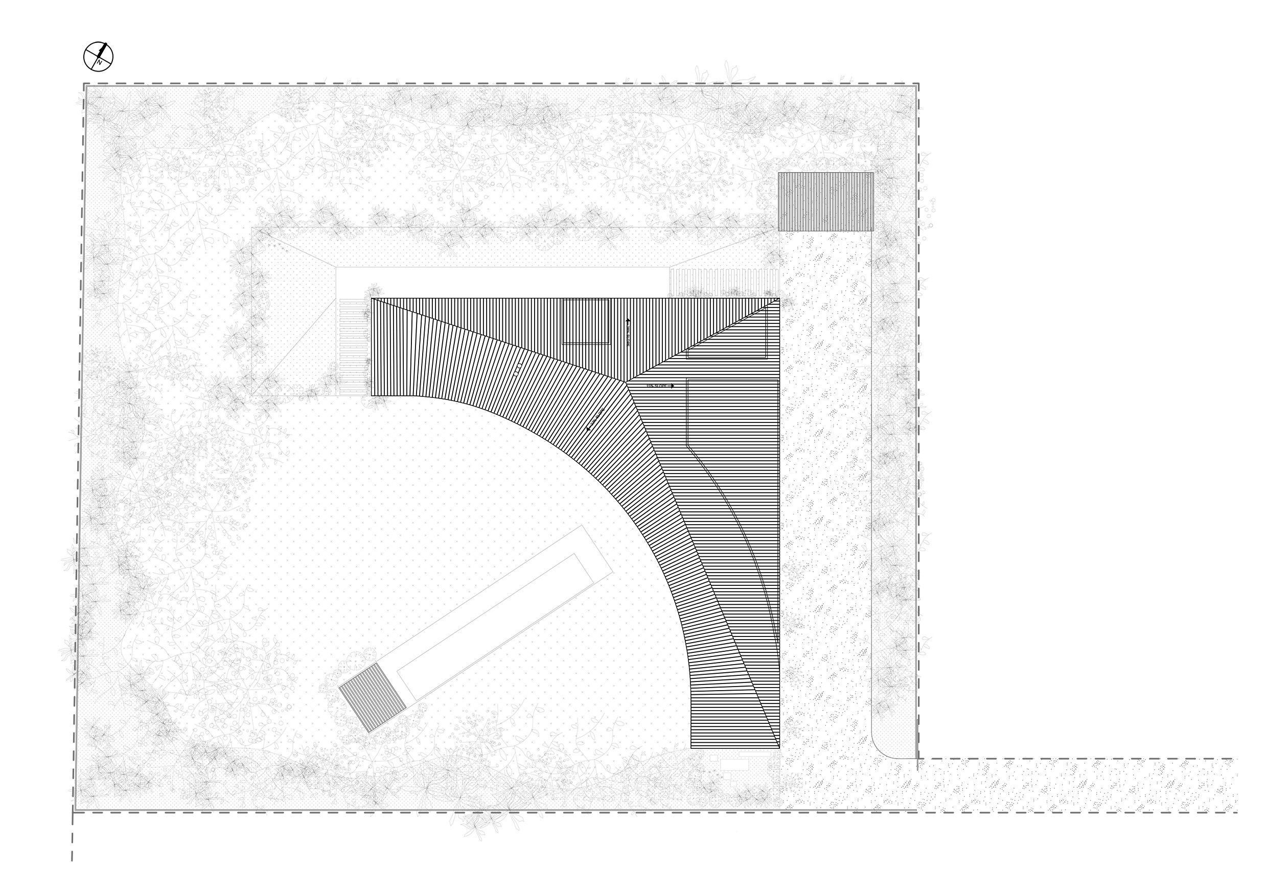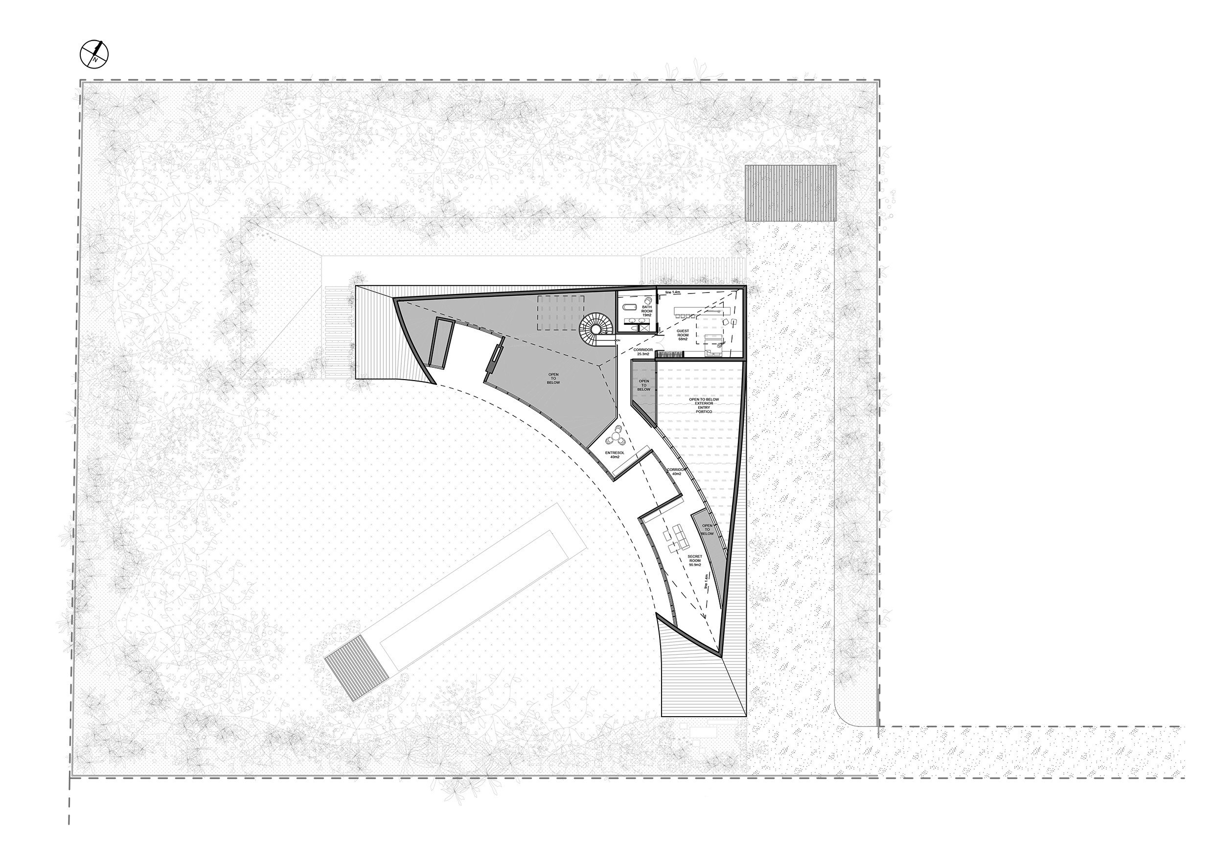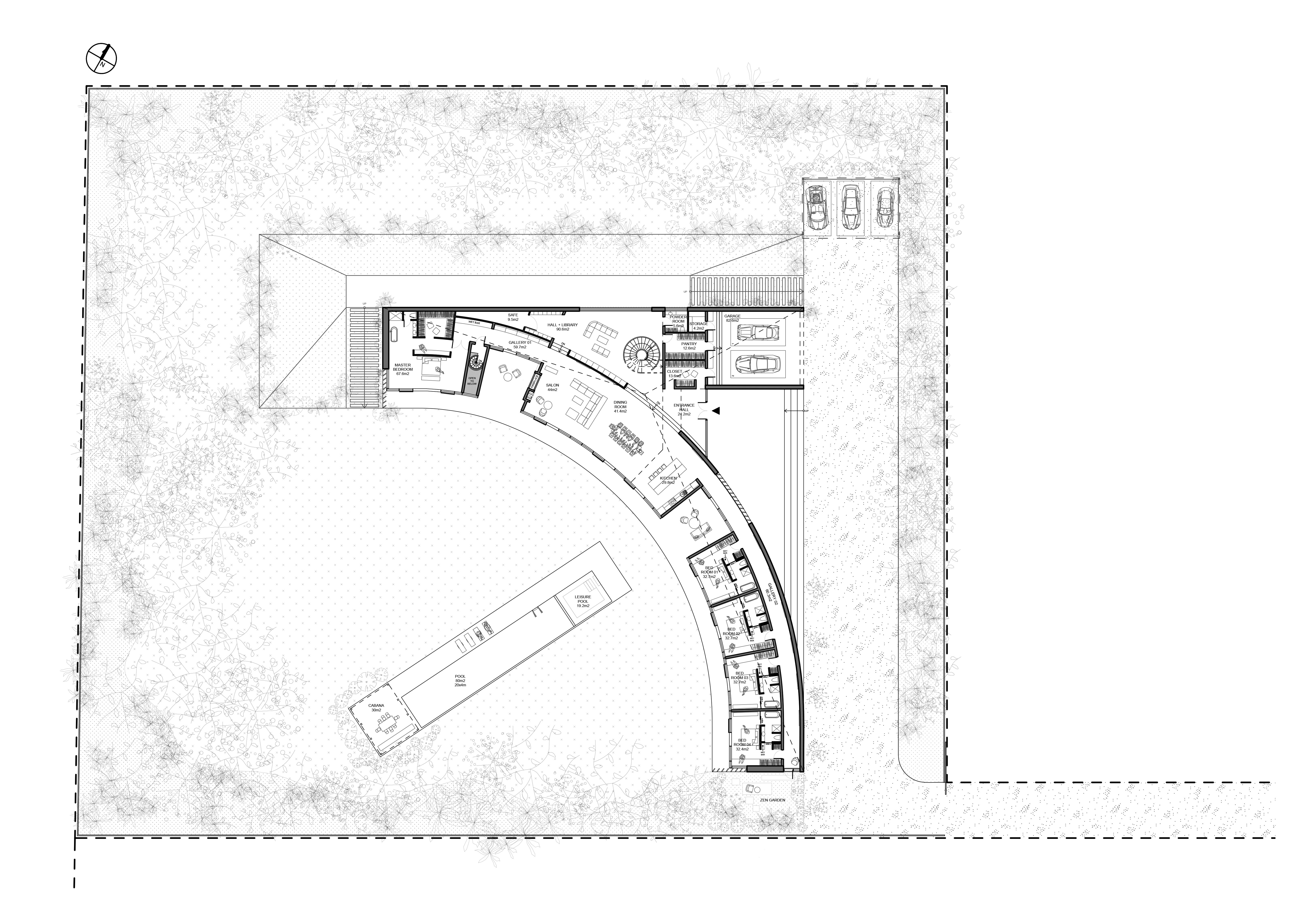 Arrival is private and restrained—an opaque north façade with a single scooping wall marking entry—then the house opens completely to the south for effortless hosting and an easy indoor/outdoor flow.