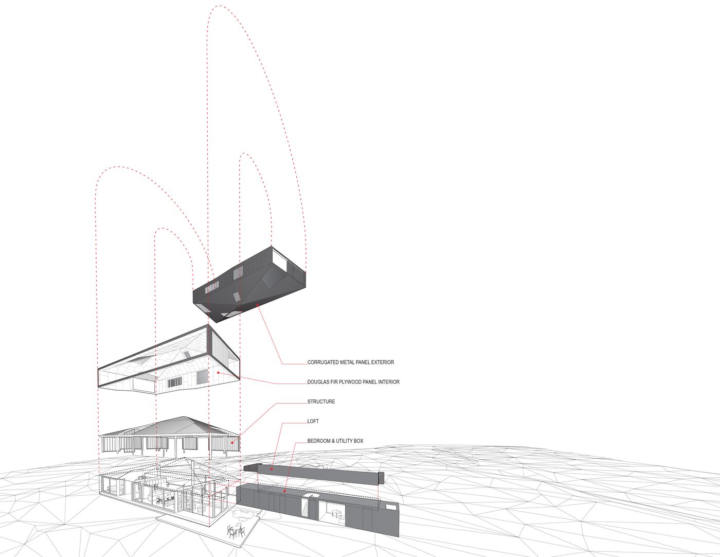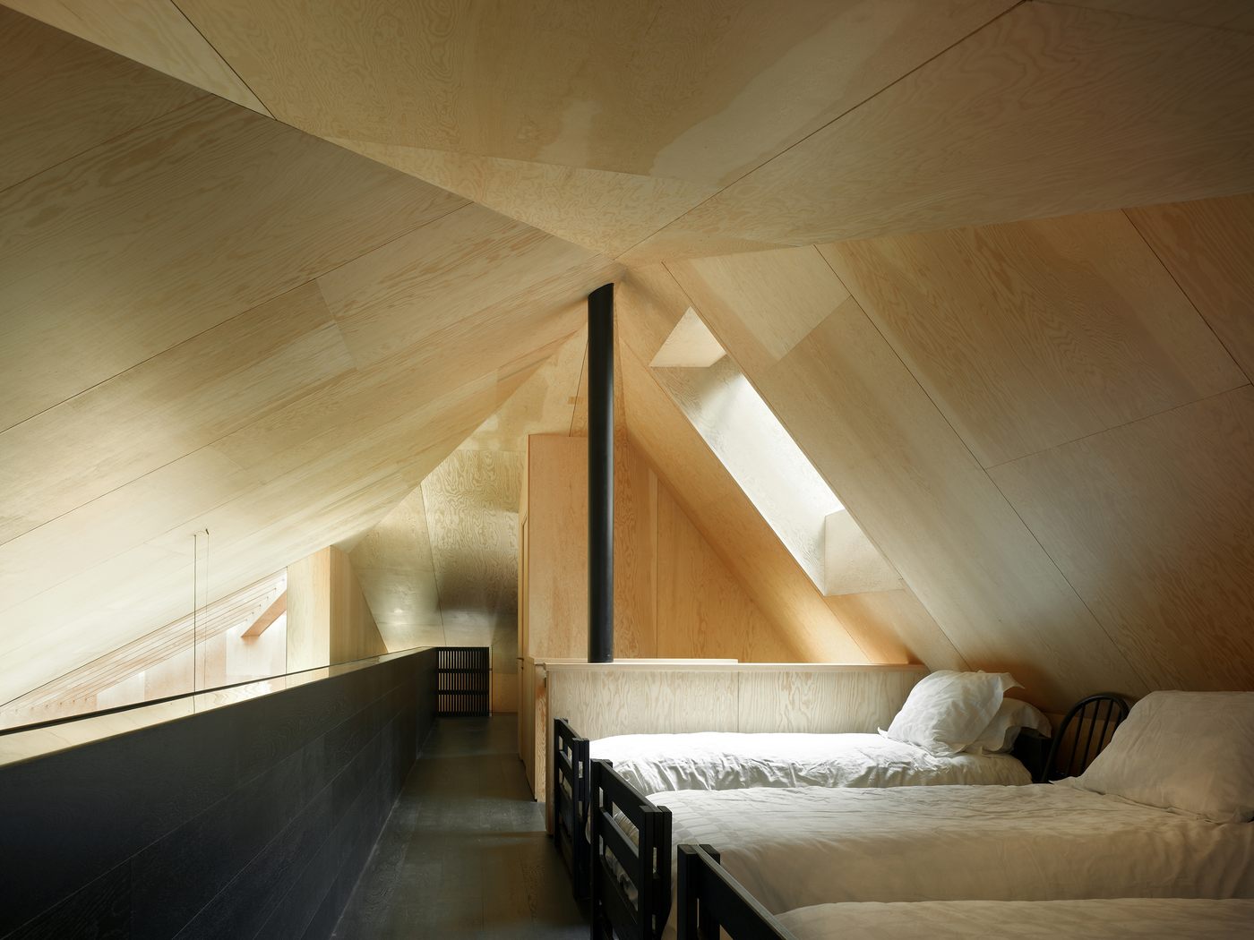 Its tent-like silhouette gathers both indoor rooms and sheltered outdoor space, blurring the edge between cottage life and the landscape.