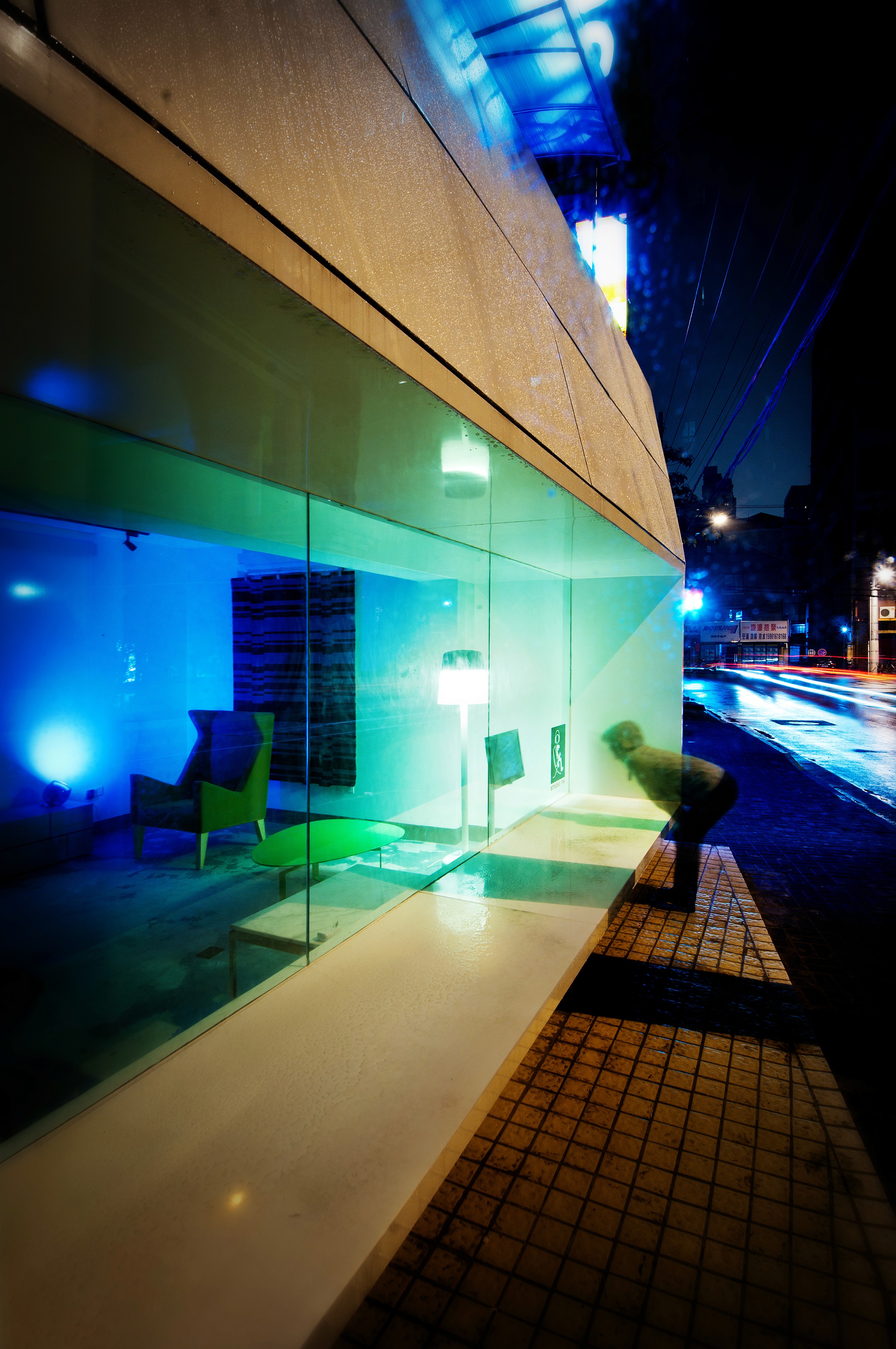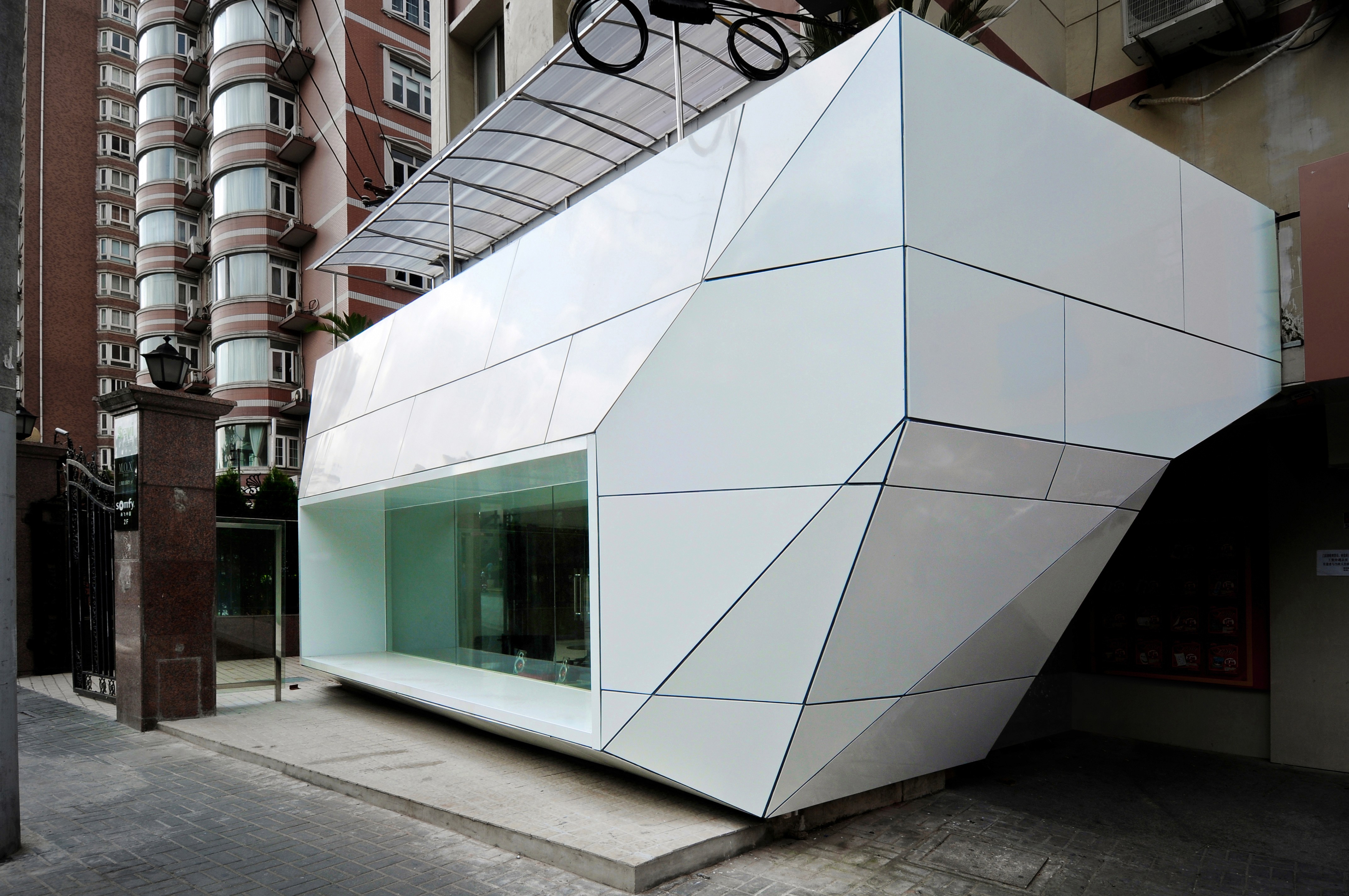 A monolithic white metal-panel “box” is cut with a frameless full-height glass opening, turning the interior into a quiet display window.