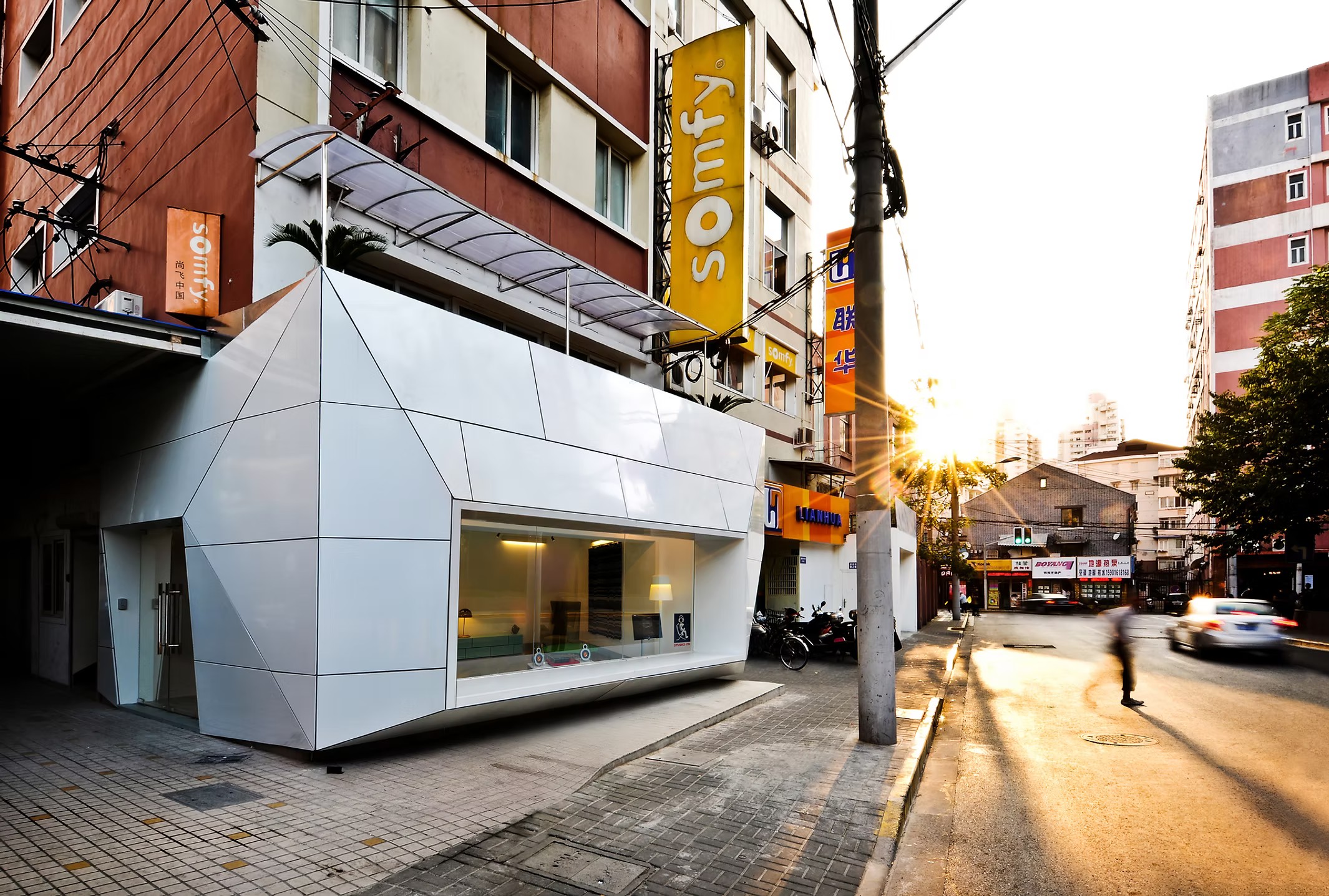 A calm white storefront inserted into the noise of Shanghai, designed to make a third-floor showroom feel present at street level.